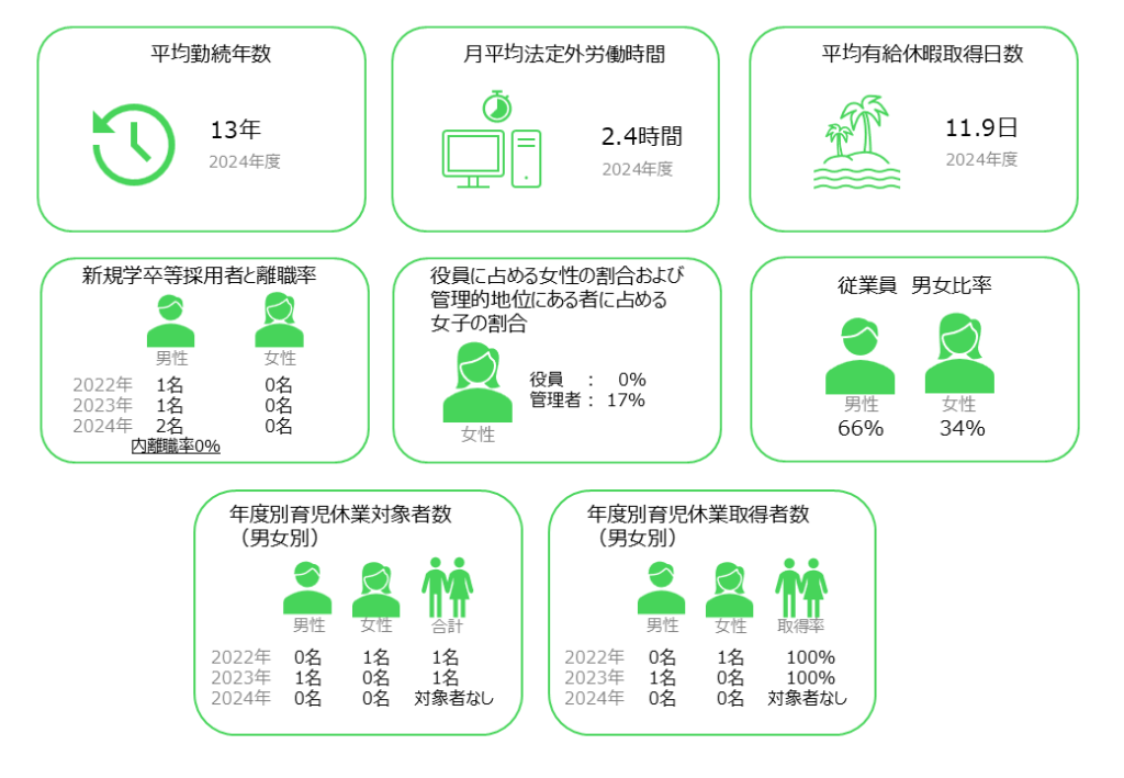 | 休日・休暇 | 完全週休二日制祝日、年末年始、年次有給休暇、慶弔休暇、育児休業、介護休業など 年間休日日数 120日以上(2024年実績) |